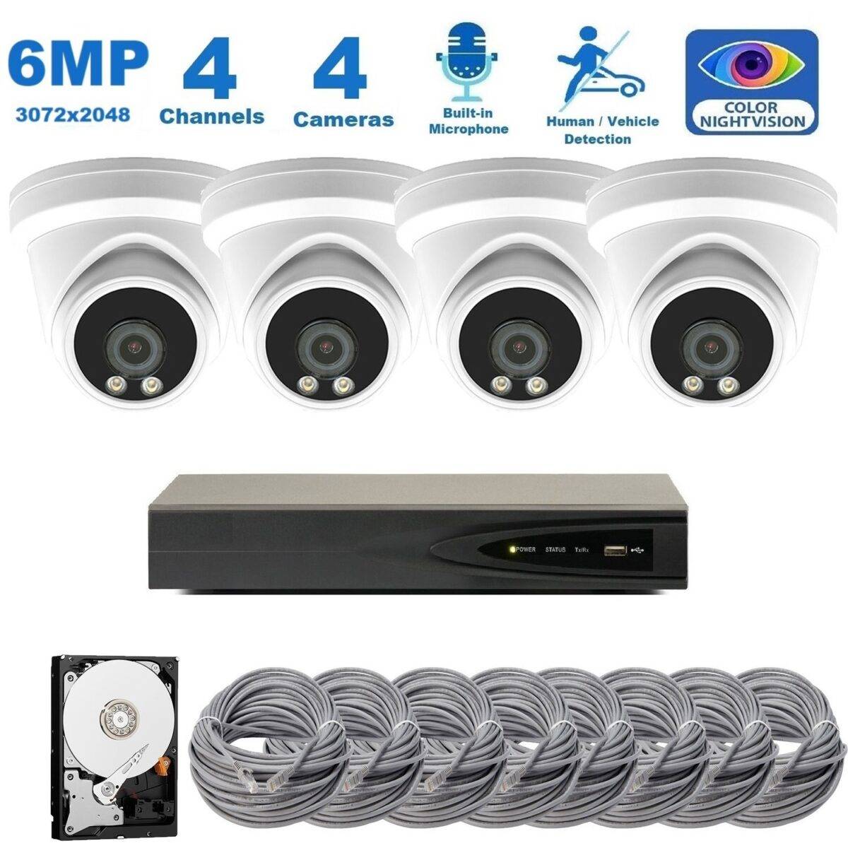 - 【Video, Audio, 6.0MP】– View in stunning clarity and sharper details with 6.0 Megapixels (3072*2048) cameras. Delivers 3 times the clarity of 1080p. IR up to 80ft; IP66 Weatherproof
